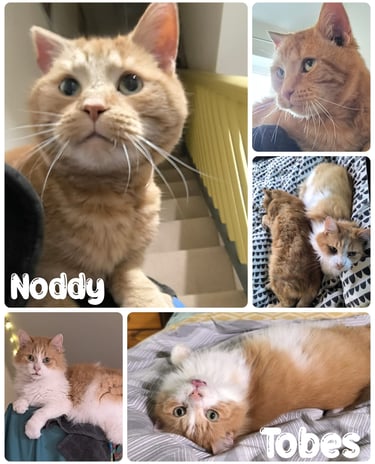 Noddy is a stage 5 clinger and all round playful little guy. He loves plastic/anything crinkly, running through tunnels, zoomies and riding on shoulders. When he's not doing that, he loves being cuddled up with Tobes or curled up in a lap. 10/10 purr machine π§‘ π§‘ π§‘